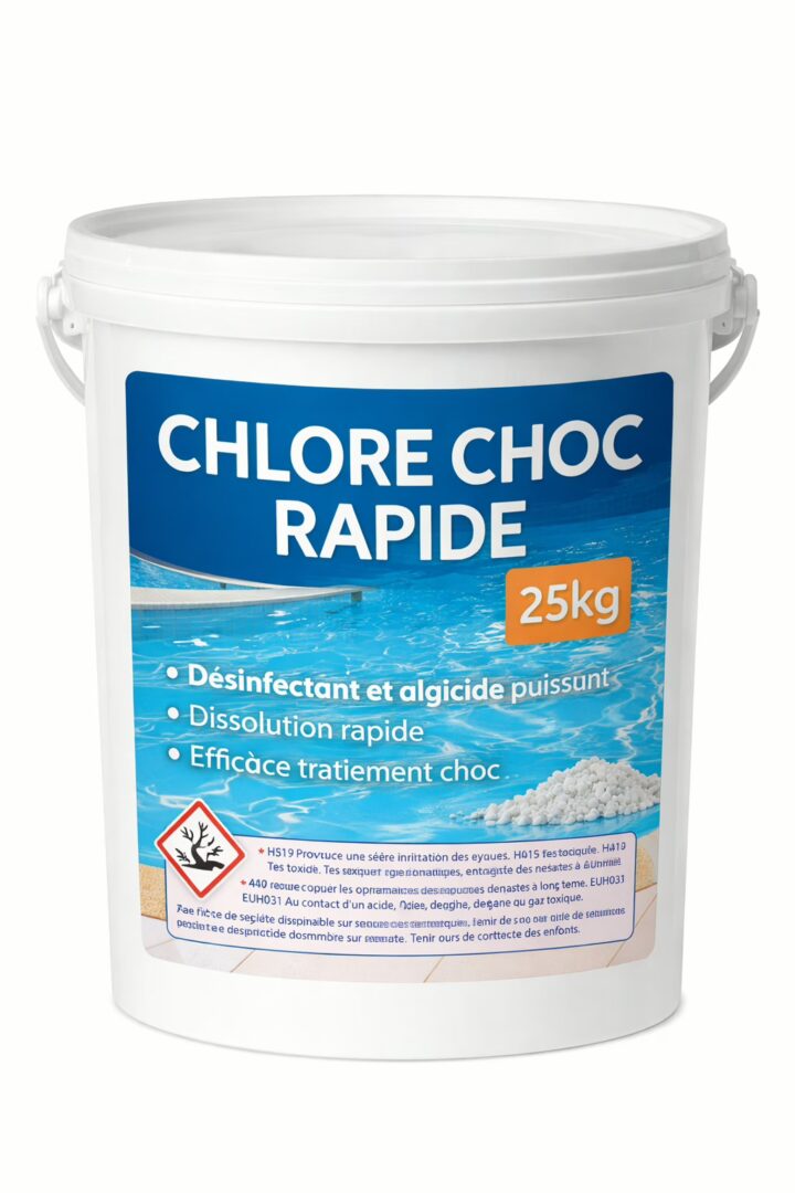 Chlore rapide en granulés pour piscine : désinfectant et algicide efficace, dissolution rapide, idéal pour un traitement choc. Assure une eau propre et saine.