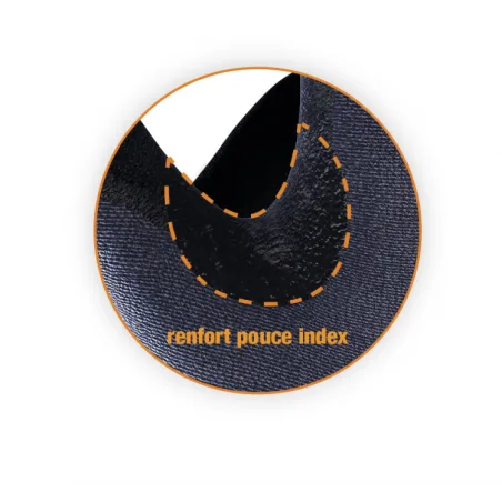 - Renforcement – entre le pouce et l’index, qui améliore la résistance à la coupure et prolonge la longévité du gant dans une zone vulnérable par nature.