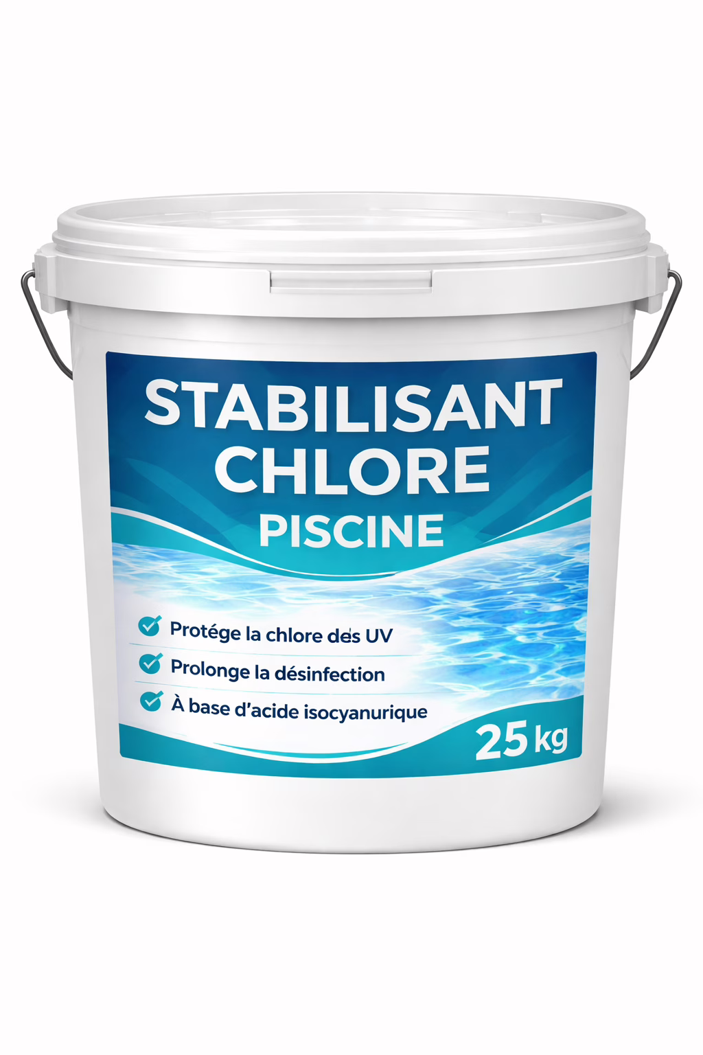 Stabilisant chlore piscine en seau de 25 kg. Idéal pour prolonger l’efficacité du chlore face aux UV.